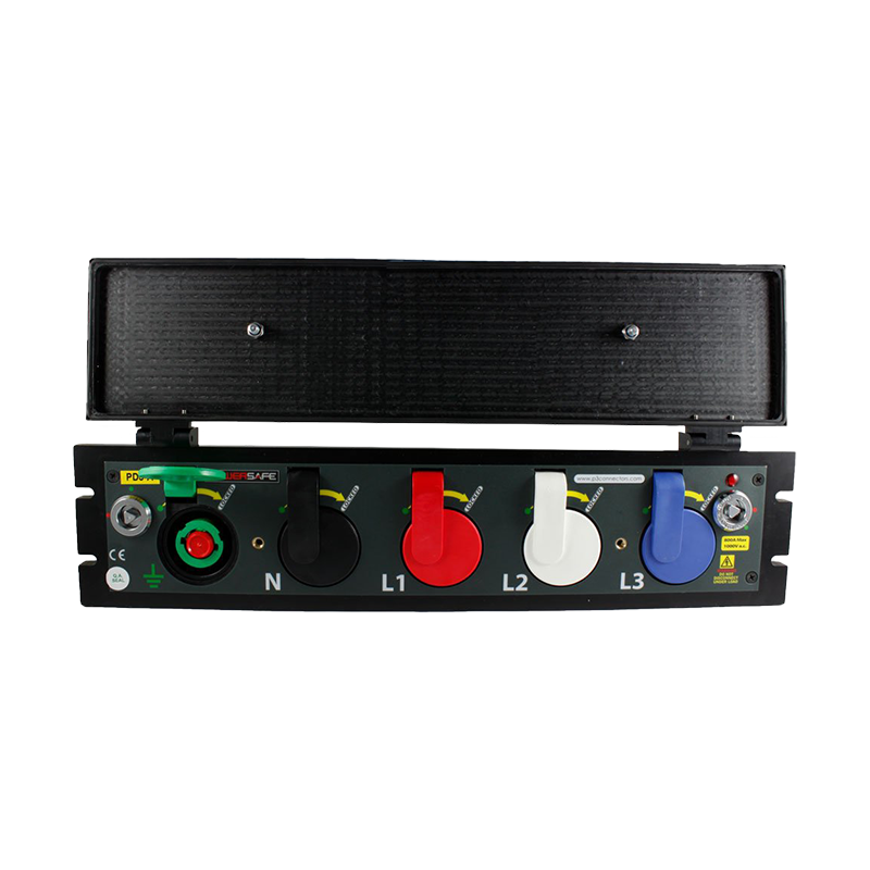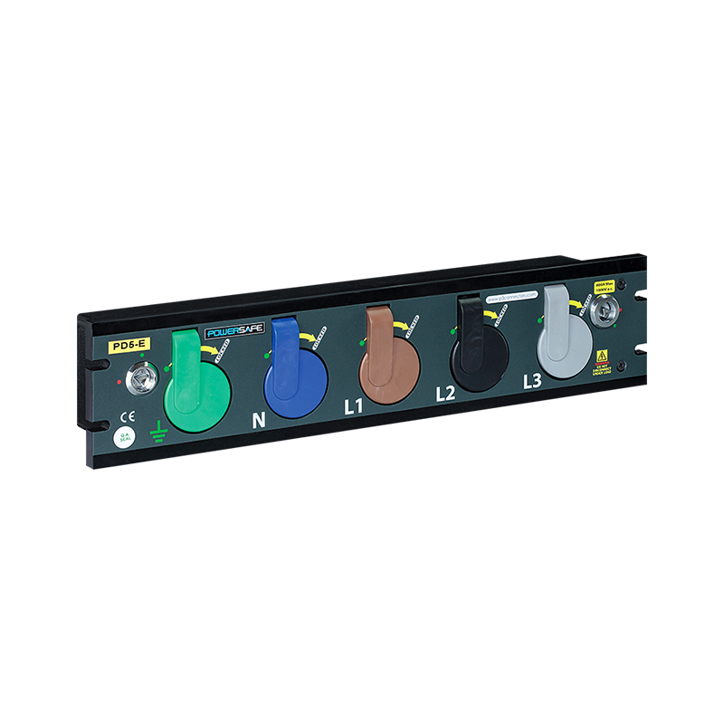 Powersafe 配电盒是三相电源上单极连接器的电气连接点,最大电流为 800 安培。Powersafe 盒具有顺序配接锁定系统,以确保安全电路先连接,后断开 (FMLB)。此外,键控设计消除了电气连接错误的可能性。